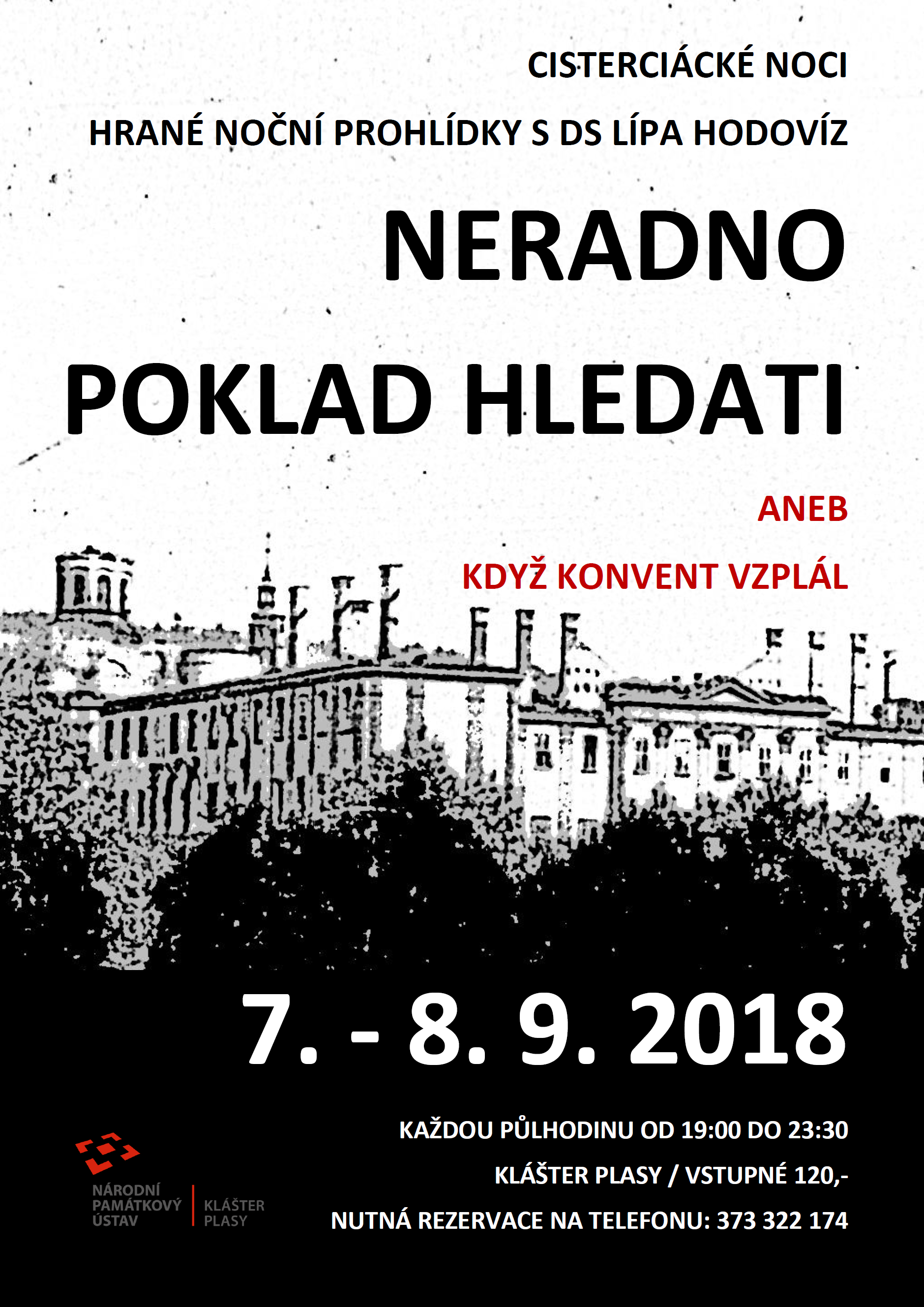 Tradiční poprázdninové hrané noční prohlídky plaského konventu vycházející od 19:00 do půlnoci každou půlhodinu. Letos se opět setkáte s Divadelním spolkem Lípa Hodovíz, který vám představí hru s názvem Neradno poklad hledati... aneb když konvent vzplál.