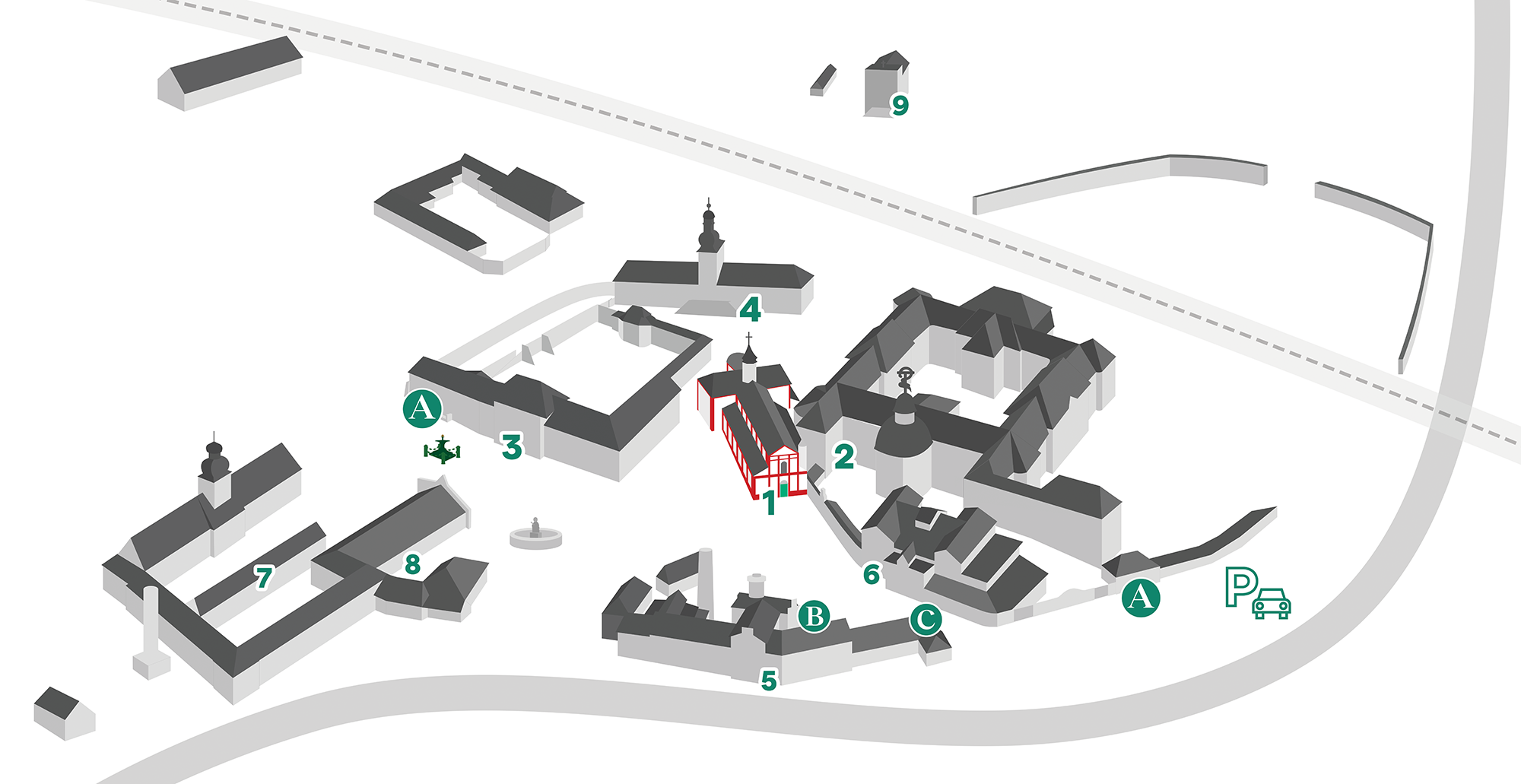 A • POKLADNA - PROHLÍDKY KOSTELA ①, KONVENTU ②, ZÁMKU ③, SÝPEK ④